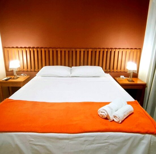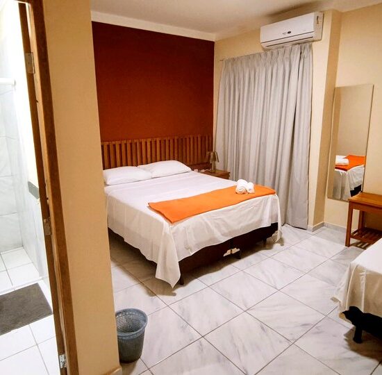 Com ambiente mais amplo e confortável, esta suíte é ideal para quem deseja um toque extra de comodidade. Possui 1 cama de casal e 1 cama de solteiro, ar-condicionado, banheiro privativo com chuveiro elétrico, roupas de cama, toalhas e Smart TV. Uma opção que combina tranquilidade e bem-estar.